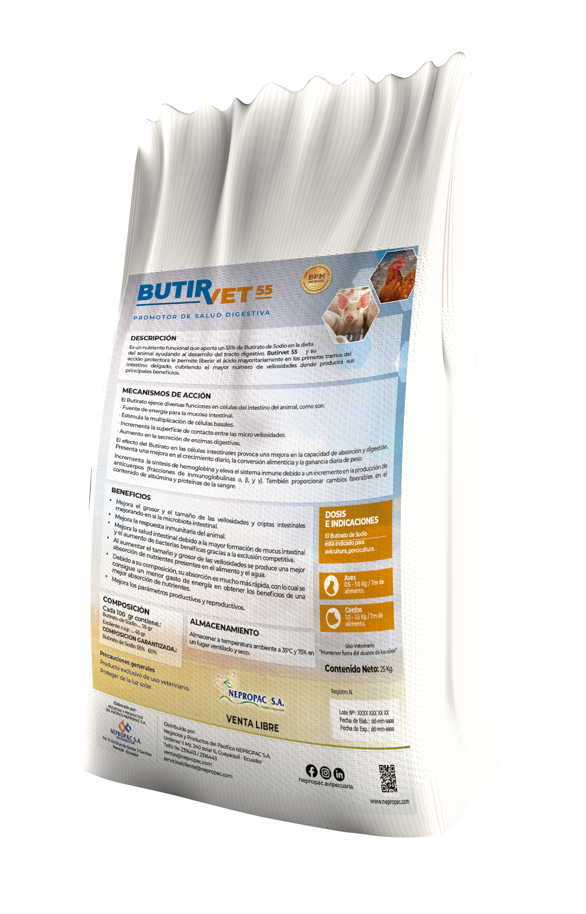 Es un nutriente funcional que aporta un 55% de Butirato de Sodio en la dieta del animal ayudando al desarrollo del tracto digestivo. Butirvet 55 y su acción protectora le permite liberar el ácido mayoritariamente en los primeros tramos del intestino delgado, cubriendo el mayor numero de vellosidades donde producirá sus principales beneficios.